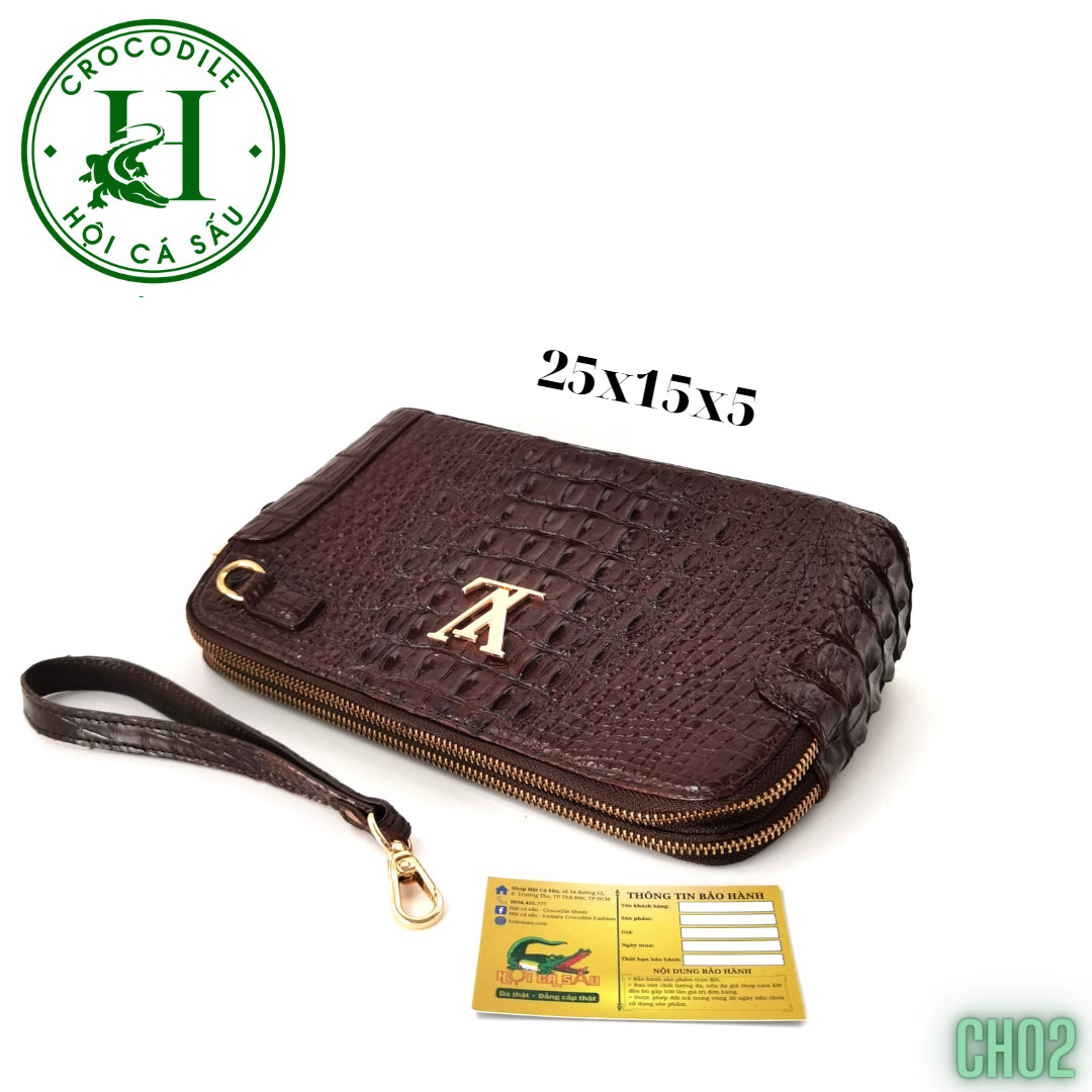 Sản phẩm Clutch cao cấp CH02 được làm từ chất liệu da cá sấu thật cao cấp, chọn lọc kỹ càng, nghiêm ngặt theo quy trình của HỘI CÁ SẤU, được gia công thủ công bởi đội ngũ thợ lành nghề HỘI CÁ SẤU đảm bảo sản phẩm có độ bền cao và đồng thời tạo nên vẻ đẹp tự nhiên, độc đáo của sản phẩm da cá sấu. Kích thước thiết kế tiêu chuẩn vừa đảm bảo tính nhỏ gọn, tiện dụng và vừa đảm bảo đầy đủ công năng sử dụng, vừa đủ để đựng các vật dụng cần thiết như điện thoại, ví tiền, chìa khóa và các vật dụng khác. Sản phẩm clutch da cá sấu có nhiều ngăn để bạn có thể sắp xếp vật dụng một cách gọn gàng, khoa học. Thiết kế sang trọng, đẳng cấp và tính tiện dụng cao, sản phẩm clutch chất liệu da cá sấu sẽ là một món quà tuyệt vời dành cho những người đàn ông yêu thích phong cách trang nhã và đẳng cấp.