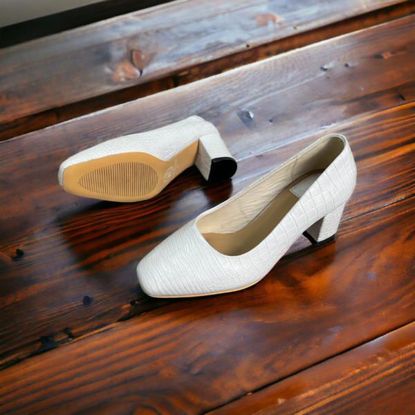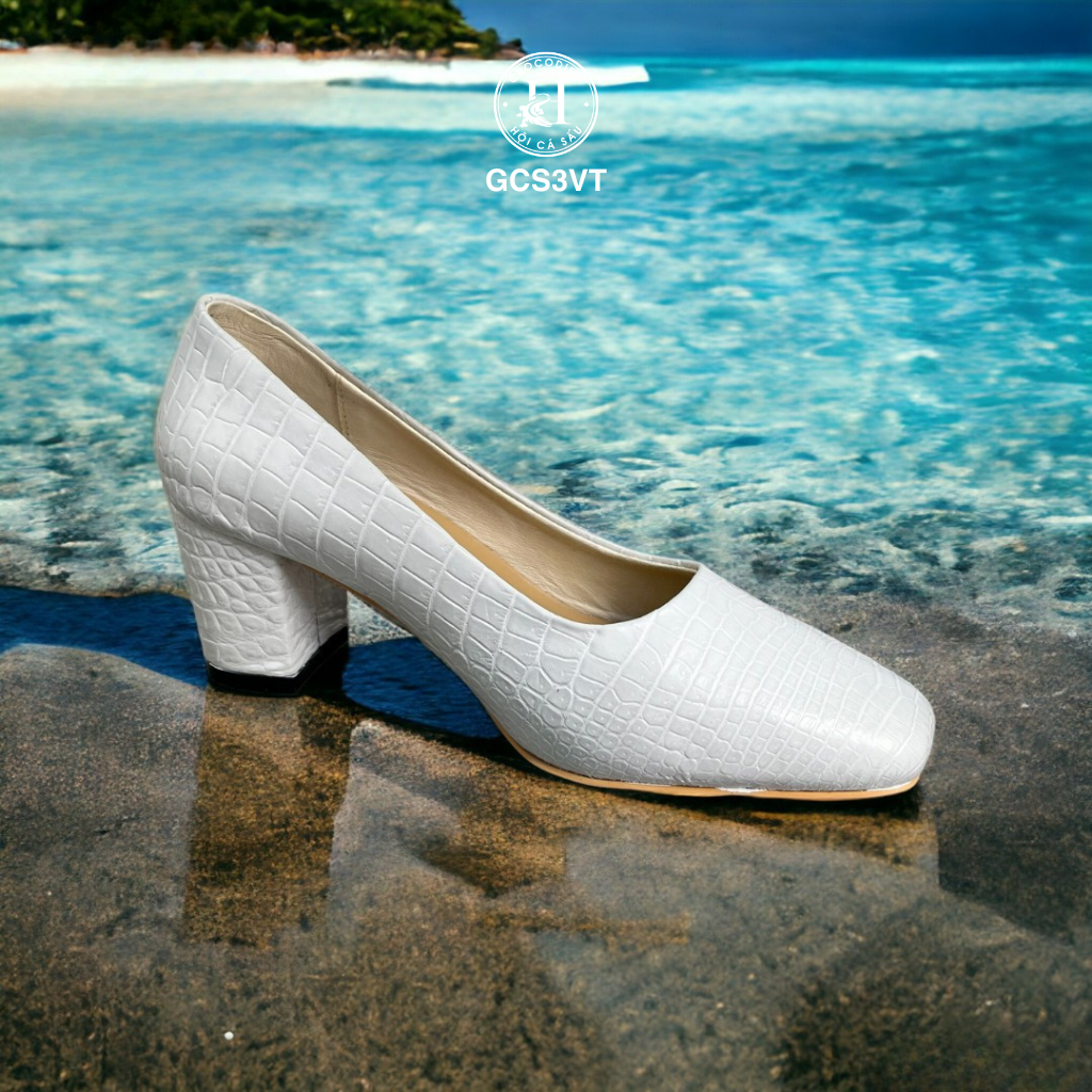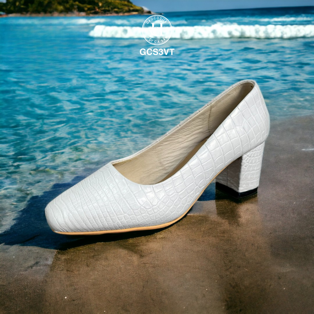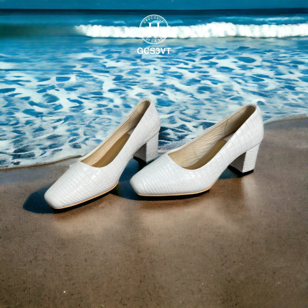 Gam màu trắng sang trọng kết hợp với đế vuông tôn dáng, mang lại sự thanh lịch tuyệt đối cho các quý cô hiện đại.