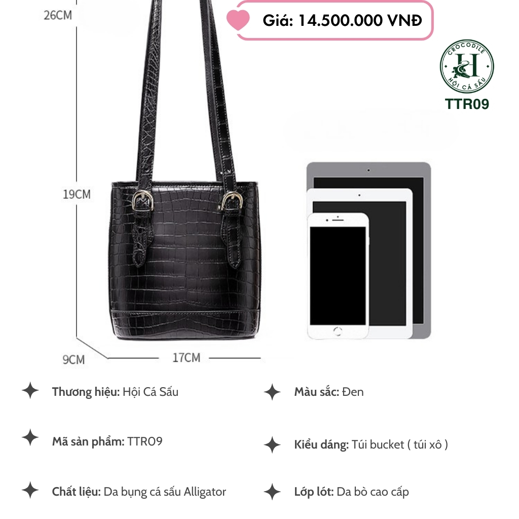 Túi xách nữ TTR09 là sản phẩm mới nhất đến từ thương hiệu Hội Cá Sấu, mang phong cách tối giản nhưng đầy quyền lực. Với kiểu dáng túi bucket (túi xô) đang thịnh hành và được chế tác từ da bụng cá sấu Alligator – dòng da đắt giá và quý hiếm, TTR09 là lựa chọn hoàn hảo cho quý cô yêu thích phong cách sang trọng nhưng không phô trương.